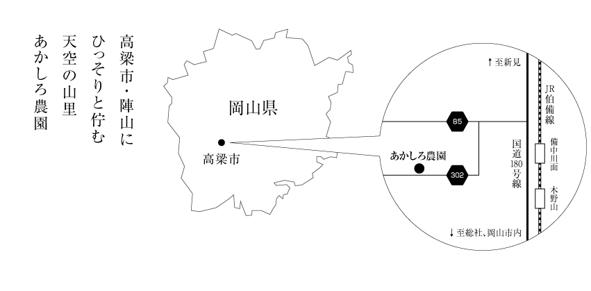 あかしろ農園は、岡山県高梁市 天空の山里・陣山で土作りからこだわり人や自然・環境にやさしい葡萄・お米・ハチミツ・野菜をこころを込めて育てている農園です。あかしろ農園の食べ物を通して私たち作り手と食べる方とのつながりを深めていくことを大切にしています。1人でも多くのお客さまの笑顔が見たいから。安心して食べられる自然のままのおいしい商品をお届けしています。